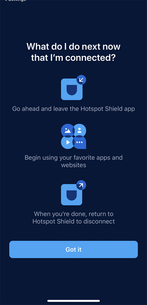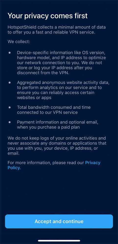 Hotspot Shield is not a zero logs service, but it doesn't collect too much information either. It will keep your IP address for the duration of your session but it is: a) encrypted and b) not linked with your activity while using the VPN.In addition, upon opening the app -- but before connecting to the VPN -- it will collect device-specific information, such as the unique mobile ID, hardware model, OS version, language, and network information. This data will reportedly help the company improve its service and perform analytics; also, it can hardly lead to Hotspot Shield identifying you as an individual user.